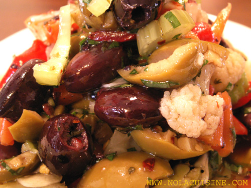 Crush each olive on a cutting board with your hand. Combine all ingredients.