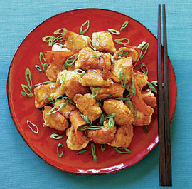 Put the orange zest strips in the skillet and cook, stirring, until they darken in spots, 15 to 30 seconds. Stir the orange juice mixture and add it to the pan. Let it boil for about 10 seconds and then add the chicken and the scallion whites. Cook, stirring often, until the sauce reduces to a glaze and the chicken is just cooked through (check by cutting into a thicker piece), 1 to 2 minutes. If the chicken isn't cooked through but the glaze is cooking away, add a couple tablespoons of water and continue cooking. Serve sprinkled with the scallion greens.