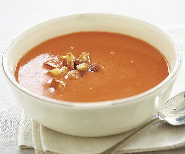 Ladle into 8 soup bowls and garnish each serving with 1 to 2 Tbs. of the croutons.