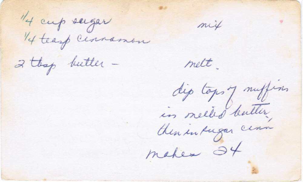 - Dip tops of muffins in melted butter then dip in sugar mix