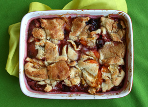 - With a knife, score 2-inch squares in the crust. Spoon fruit juice over the top, then push the squares down slightly with the back of the spoon. Return the dish to the oven and bake until fruit is tender and pastry is browned on the edges and flaky, about 25 minutes. Let cool 30 minutes and serve.