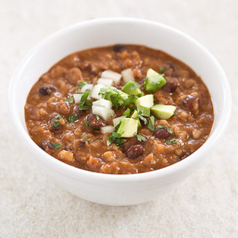 Vegetarian chilis are often little more than a mishmash of beans and vegetables. In order to create a chili—not a bean and vegetable stew—we’ve found replacements for the different ways in which meat adds depth and flavor to chili. Walnuts, soy sauce, dried shiitake mushrooms and tomatoes add hearty savoriness. Bulgur fills out the chili, giving it a substantial texture. The added oil and nuts lend a richness to the chili, for full, lingering flavor.