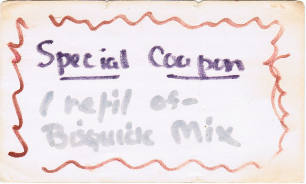 Homemade Bisquick. When I moved into my first apartment on Dupont Ave in Minneapolis, Mom gave me a batch of Bisquick and this coupon for a second free batch so I could make sure and have pancakes and waffles on the weekend. I keep the coupon in my recipe file to remind me.
