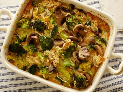 - In a bowl combine mayonnaise, yogurt, cheddar cheese, blue cheese dressing, eggs, salt, pepper, and flavor pack from noodles. In a separate bowl combine broccoli, mushrooms, and broken noodles then toss together wet mixture and vegetables to evenly coat. Place in an 8 by 8-inch baking dish that has been sprayed with non- stick cooking spray and cook for 45 minutes covered. Then remove cover and bake for additional 15 minutes to brown. Cool for 15 minutes before serving.