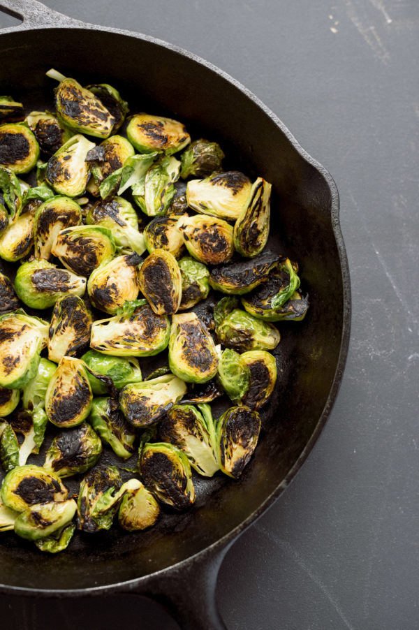 - Return the skillet to high heat. Add the sprouts (reserve the bowl) and use tongs to arrange them cut-side down in a single layer. Cook, without moving, until deeply browned and blackened in spots, 3 to 7 minutes, depending on your skillet. Use the tongs to flip the sprouts cut-side up and cook until charred and just tender, 3 to 5 minutes.