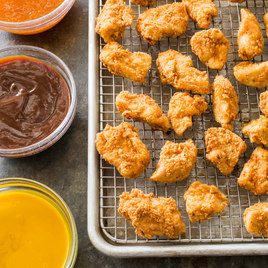 WHY THIS RECIPE WORKS: Some Chicken Nuggets recipes took the least desirable parts of the chicken and put them through a grinder. We opted for skinless, boneless chicken breasts so we would know exactly which parts of the chicken we were eating. Brining the chicken prevented it from drying out, and seasoning the breast meat combated its inherently bland flavor. We cut the brining time in half by slicing the meat into nuggets beforehand.