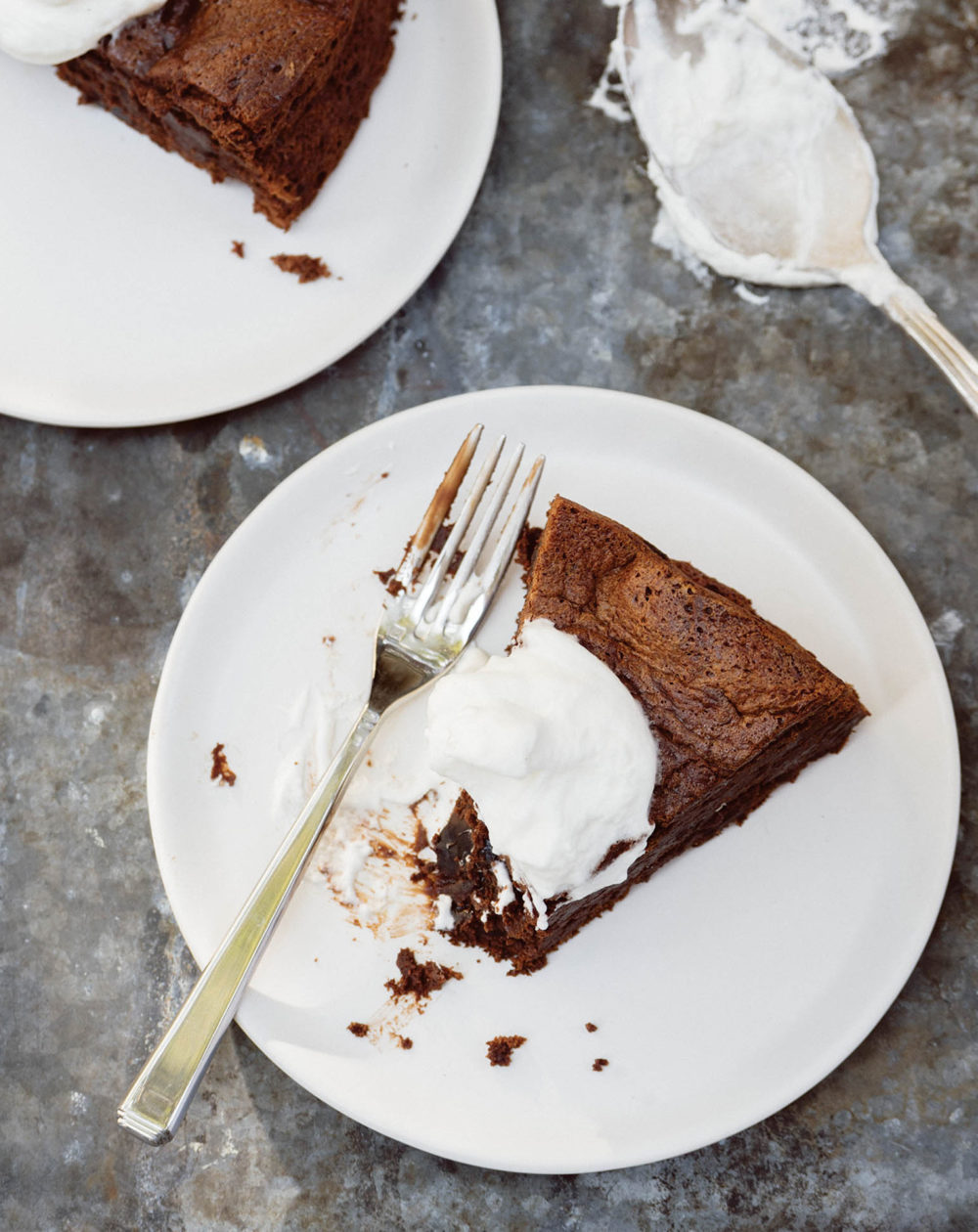 Milk Street: We were smitten with Claire Ptak’s chocolate, prune and whiskey cake, but when we got the recipe back to Milk Street we knew we needed to make adjustments. Most home bakers aren’t as skilled as Ptak, and we wanted a cake people would fall in love with on the first try – as we did when we tasted her version. Her cake is deliciously gooey at the center, and we wanted to keep that. A ratio of 3:1 chocolate to butter – as well as 8 ounces of chopped pitted prunes – got us the results we wanted. We tried a variety of chocolates and preferred bar chocolates with 60 to 70 percent cacao (especially the Ghirardelli and Guittard brands). Chocolate chips contain stabilizers that can change the cake’s texture; it’s best to avoid them. Ptak uses almond flour, not an uncommon ingredient in flourless chocolate cakes such as this, but certainly not a common ingredient in American homes. In an effort to streamline, we reworked the cake a bit to leave it out and found the results just as good. At first we questioned the need to whip the egg yolks and whites separately, but we discovered it made a big difference. Whipping the yolks helps maintain the emulsion of chocolate and butter; skipping that step produced an unpleasantly dense cake. And of course by now we understood the value of under-whipping the egg whites and just barely mixing them into the batter. Ptak originally made this cake with Armagnac, but later switched to whiskey. We couldn’t easily find the former, and the latter – while delicious once the cake was cooled – tasted harsh when the cake was warm (and this cake begs to be eaten warm). We found dark rum tasted delicious warm or cooled and better complemented the molasses.