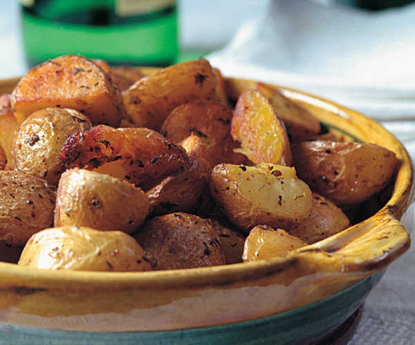 - Spread the potatoes in a single layer in a medium roasting pan or rimmed baking sheet. Drizzle with the oil, season with the herbs, salt, and pepper, and toss to coat well.
