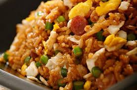 “I have never used a recipe for fried rice. Just heat up some oil or bacon fat in a frying pan, saute some meat and veggies, whatever you want (leftover beef, chicken, pork, salmon, hamburger, sausage, hotdogs…whatever), add some garlic, onion, soy sauce, sesame oil, salt, pepper, add the STALE rice (ie, leftover from previous night's dinner), then lastly frozen peas or corn, thawed, let simmer/steam until heated through, and serve.