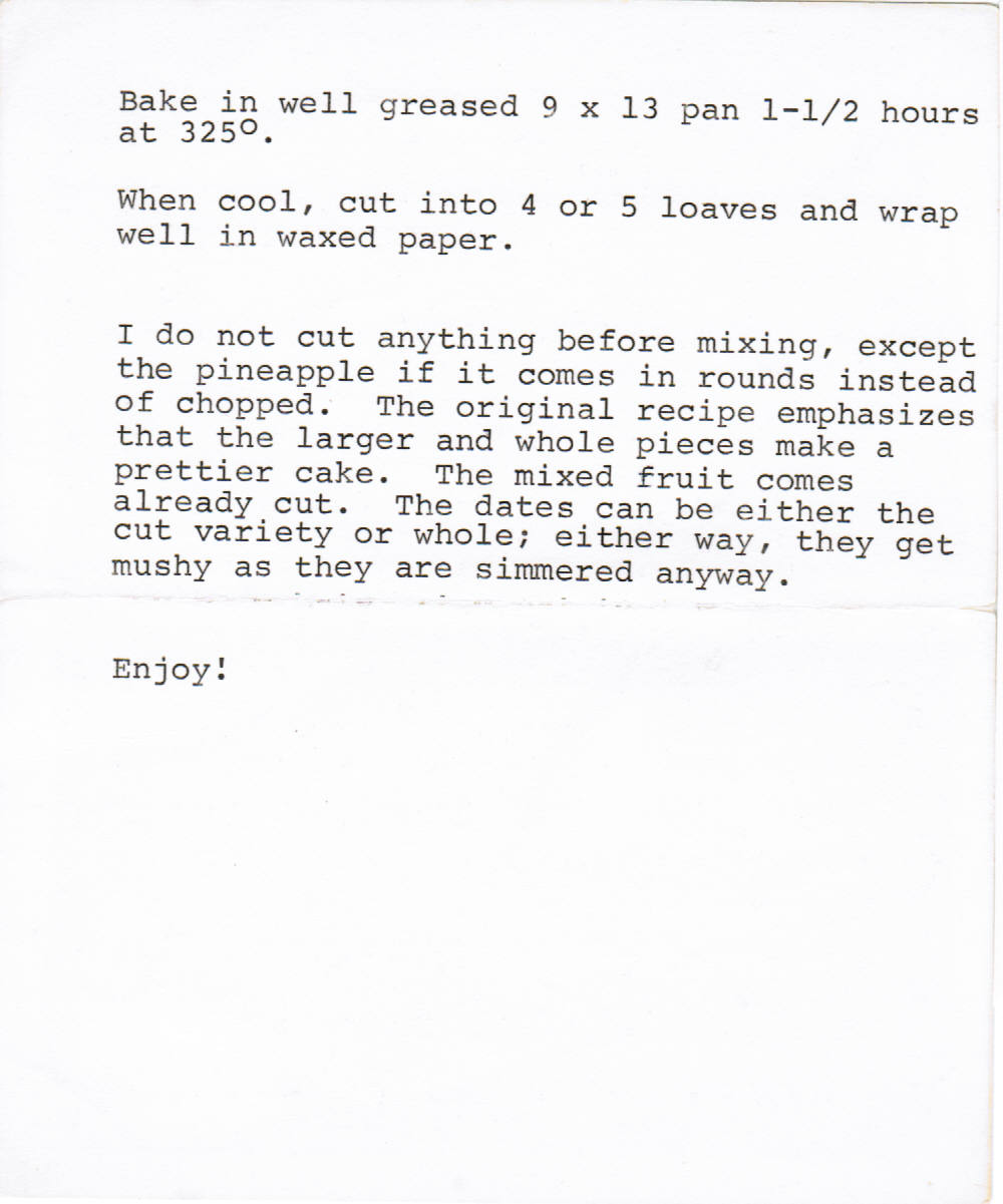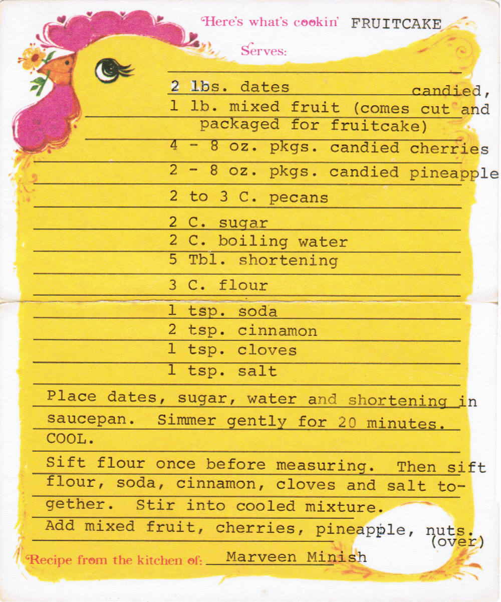I love fruitcake. Most every year we'd receive one as gift and my father and I would enjoy every bit. I'm not sure if Mom or Andrea liked it, though. This is a recipe my Mom got from Marveen Minish and had on file. I don't know if Mom ever made it, but it's probably a good one.