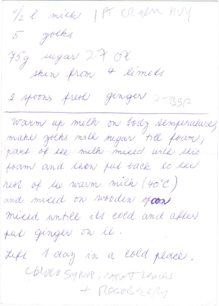 I found this dessert in 1999 in Praque while I was visting my “Freakin' Foreigner” brother Uwe. He took me to the Circle Line restaurant and the waitress talked me into trying the soup. Here's how I described it in my travelogue: “All this, it turned out, was but a prelude to the dessert; ginger-cream soup with a ribbon of chocolate syrup and quartered strawberries. Lions and tigers and bears- oh my! I have never tasted anything like it. Crisp, clean, sweet, lightly creamy, a touch of tartness and full of ginger perfume. I have rarely been so disappointed to see the bottom of a soup bowl in my life. My latest cooking mission has been found- re-creation of the perfect ginger soup. A worthy challenge on a par with the great quests from Greek mythology.” Yes yes, a bit hyperbolic, but I still remember that first taste. The next afternoon I was talking about my quest with Uwe and he thought that the concierge at the hotel he managed at the time (I think it was a Hilton) could get the recipe from the restaurant. She called, and after about 15 minutes of discussion and a strict promise that I would not use it in a restaurant in Prague, she got it. Her written notes are below.