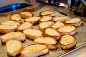 - Place bread in oven on sheet pan and broil until golden brown on both sides, approximately 2 minutes for the first side and 1 to 1 1/2 for second side.