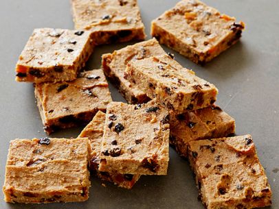 - In a third mixing bowl, whisk the tofu until smooth. Add the apple juice, brown sugar, eggs, and peanut butter, 1 at a time, and whisk to combine after each addition. Add this to the protein powder mixture and stir well to combine. Fold in the dried fruit. Spread evenly in the prepared baking dish and bake in the oven for 35 minutes or until the internal temperature reaches 205 degrees F. Remove from the oven and cool completely before cutting into squares.