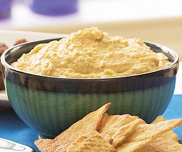 - Purée the chick peas, olive oil, lemon juice, tahini, garlic, coriander, cumin, 1/2 tsp. salt, and 1/3 cup cold water in a food processor until smooth. Cover and refrigerate at least 4 hours before serving. Season to taste with more lemon juice and salt just before serving. Serve cool or at room temperature accompanied by fresh pita wedges or toasted pita chips.
