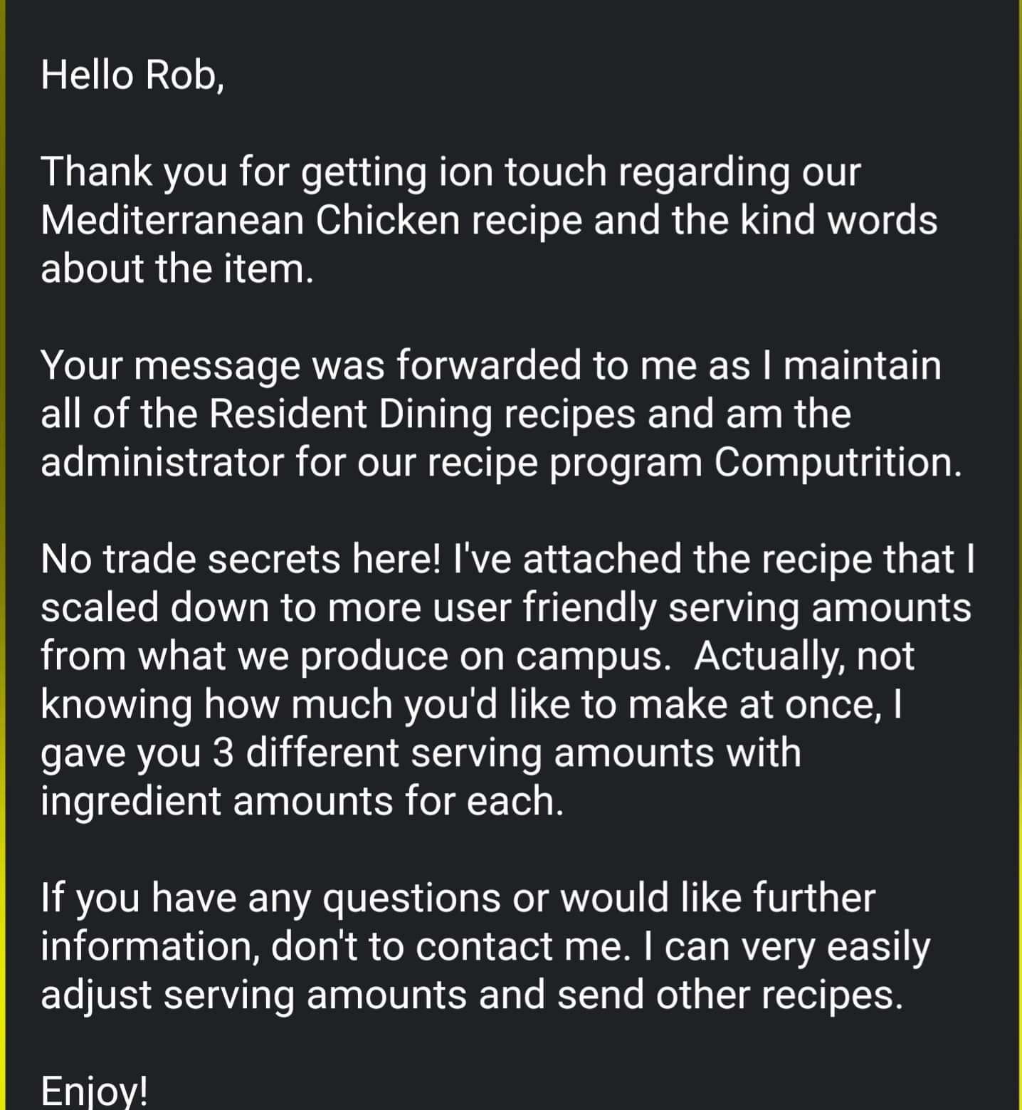 I reached out to my University (I graduated in 2014) asking if they could share the recipe to my favorite dish from the dining hall. I didn't expect a reply!