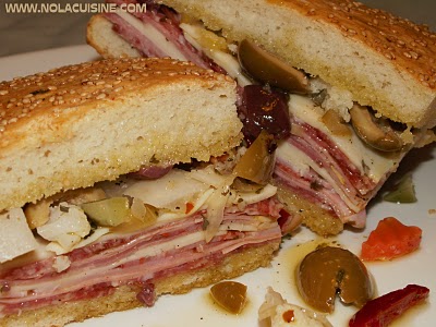 Back to the recipe, I make a pretty good Muffuletta, but I’ll be honest, it’s no Central Grocery, but it’s pretty darned good. The quality bread, as I just emphasized is important, you need about a 10 inch round loaf with a good coarse texture, and a nice crust (not too hard) and sesame seeds. Here is my recipe, with a deep, humble bow to Central Grocery.
