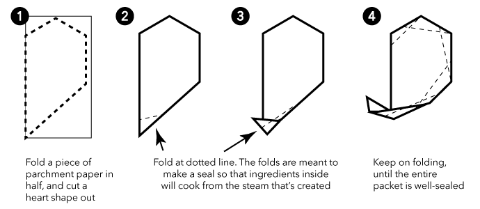 - Fold a 14×12“ piece of parchment paper in half. (The technique also works for grilling; just substitute aluminum foil.) Using kitchen shears, cut the parchment into a heart shape.