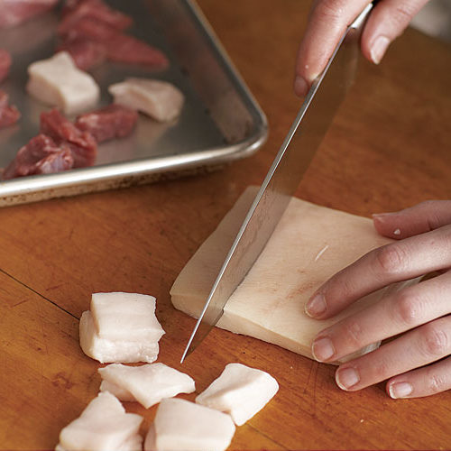 1. Trim and discard any gristle or connective tissue from the pork. Cut the pork and pork fat back into 1-inch cubes.
