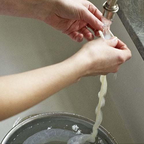 1. Put the hog casings in a medium bowl and set it in the sink. Rinse the casings under cool running water: Hold one end of each piece of casing open under the tap and flush it out by gently running cool water through it. (Once you fill part of the casing, use your hands to push the water through to other end.) Fill the bowl with fresh, cool water and let the casings soak for 10 minutes.