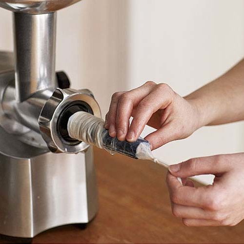 Fill the hopper with the sausage mixture and feed it through just until it reaches the end of the stuffing tube. Check with your finger to feel if the meat is flush with the opening. Tie the end of the attached casing into a knot, and slide it up over the tube until the knot hits the tip of the tube.