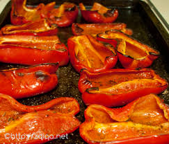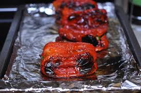 - Place 2 Red bell Peppers (remove the blasted sticker!) on a baking sheet, place in the oven. In 15-20 minutes flip it over. Leave it in the oven for another 15-20 minutes.