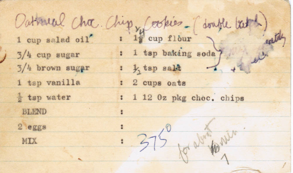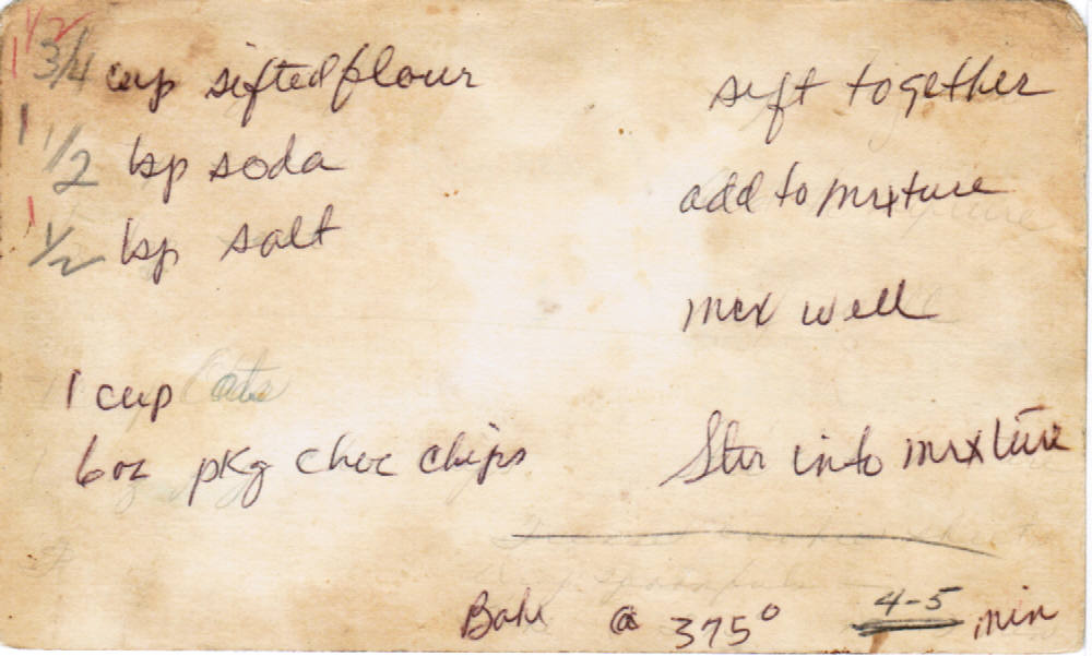 When I was a teenager, my mother made the mistake of telling me that I could make these anytime I wanted. So I made them anytime there were chocolate chips around the house. Mom wanted to have some chocolate chips on hand in case she needed them, so she started to hide a few at a time. I would then go look for them and hide them myself. I'd then have chocolate cookies whenever I wanted them.