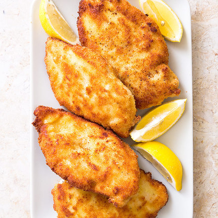 Why this recipe works: For crisp, moist fried chicken, we start by pounding chicken breasts to an even 1/2-inch thickness to ensure even cooking. Seasoning the chicken, instead of the breading, guarantees that the meat will be well seasoned. Homemade bread crumbs are easy to make and give a light, crisp texture. Using a standard breading procedure (dipping in flour, beaten egg, and bread crumbs) ensures that the breading will stay in place. Shallow-frying cutlets, two at a time, ensures even cooking without creating too much steam that would otherwise leave the bread crumbs soggy. Gently pressing the cutlets with a spatula ensures that they will lie flat while they fry. Finally, resting the cutlets on a paper towel–lined wire rack for about 15 seconds per side removes grease. Moving the cutlets to the unlined side of the wire rack kept the coating crisp while we finished the next batch.