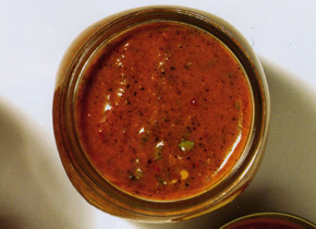 - After the 20 minutes, add vinegar to tomato mixture and cook for 1 minute. Add toasted pumpkin seeds. Place mixture in a blender, and blend until smooth.
