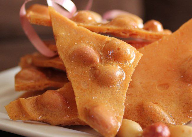 - Stir in peanuts and set a candy thermometer in place. Continue cooking, stirring occasionally, until the temperature reaches 300 to 310 degrees F (150 to 155 degrees C)