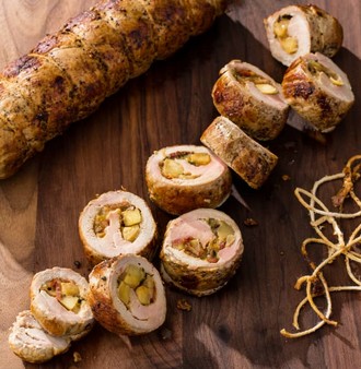 We wanted to create an ultraflavorful pork tenderloin recipe by packing the meat with a pungent stuffing. To stuff it without leaking, we butterflied the meat, meaning we sliced the tenderloin nearly in half lengthwise. We then pounded the tenderloin to an even thickness before rolling it around a mixture of salty, smoky bacon and sweet, tart apples and tying it with kitchen twine. Gruyère cheese bound the bacon-and-apple stuffing together while adding nutty richness.(ATK)