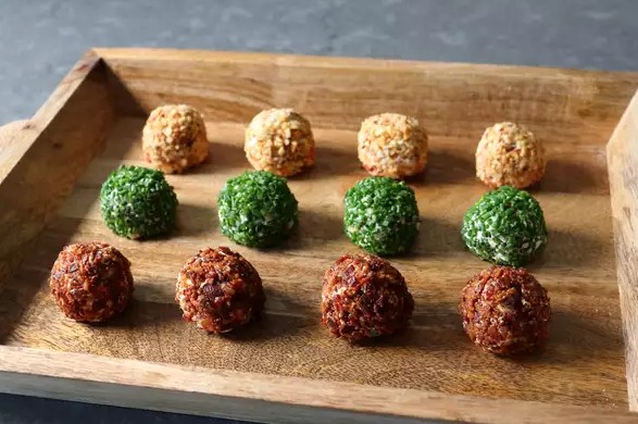 - Use a sorbet scoop or spoon to form tablespoon-sized balls of cheese mixture; place on a lined sheet pan. Cover and refrigerate until firm, about 1 hour. A perfect shape doesn't matter at this point since these will be rolled in the coatings to complete the process.