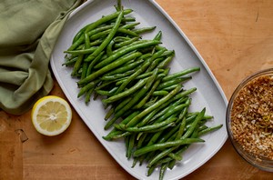- Combine first 4 ingredients (olive oil through salt) in a large bowl. Add green beans; toss to coat. Place green bean mixture in 13 x 9-inch baking dish; bake at 500 for 10 minutes or until crisp-tender.