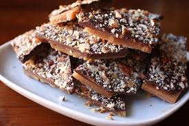 - Spread over toffee; sprinkle with nuts, pressing them into chocolate.