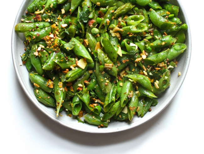 - 12 oz. sugar snap peas, halved crosswise on the bias