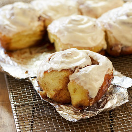 For big cinnamon flavor with no other distracting spices, we blended a good amount of cinnamon with brown sugar. To keep the filling from spilling out as we rolled the dough, we slathered softened butter all over the dough. Baked together, the butter and cinnamon sugar turned into a truly rich, gooey filling. Instead of the usual cream cheese and butter frosting, a thick glaze made with cream cheese, confectioners’ sugar, and milk did the trick.