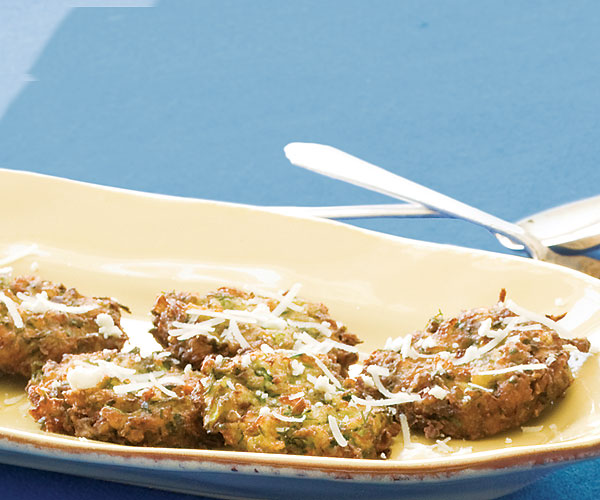 - Arrange the fritters on a platter and sprinkle with both cheeses. Serve warm.